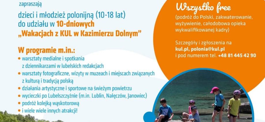 Towarzystwo Przyjaciół KUL oraz Katolicki Uniwersytet Lubelski Jana Pawła II i Akademia Nowoczesnych Mediów i Komunikacji KUL zapraszają dzieci i młodzież polonijną, w wieku 10-18 lat, do udziału w 10-dniowych “Wakacjach z KUL w Kazimierzu Dolnym” w dniach 6-15 sierpnia. Organizatorzy zapewniają atrakcyjny program pobytu, zakwaterowanie, wyżywienie, całodobową opiekę wykwalifikowanejCzytaj Dalej